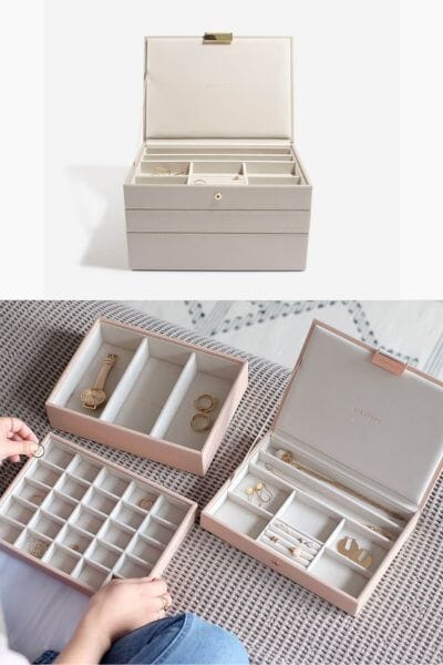 This practical Stackers Jewelry Box is perfect for organizing her everyday jewelry easily! Plus, she can add on stacking trays to increase her jewelry storage. Discover this luxurious jewelry box organizer set, meticulously crafted in England with the finest quality and thoughtful details. This exquisite set combines three essential stackers, including the Classic Lidded Box, 25-Section Tray, and Deep Tray. Each tray is wrapped in cruelty-free vegan leather over MDF and features a plush velvet interior, providing a safe haven for your precious jewelry. The stackable design allows you to customize your storage solution, while the modular concept lets you add Mini and Supersize Stackers as your collection grows. Choose from several great colorways.