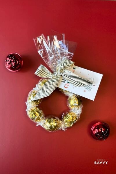 To make these easy DIY chocolate wreath homemade Christmas gifts, you only need a few supplies. You can choose what type of round chocolates that you want to include in your wreath, but I highly recommend Lindt candy truffles or the Ferrero Rocher Chocolates, wrapped in gold foil. I used 7 Lindt truffles in my chocolate wreath, but if you are using the Ferrero Rocher candies, they are a tiny bit bigger and 6 of those works great. You can experiment with how many candies you want to include! We’ve included photos of the project below.