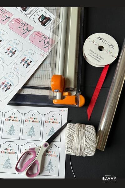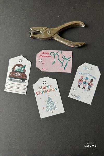 First download our free printable gift tags file (in the sign up below). Each page has 8-9 tags per page and you can use any extra tags for other gifts or save them for later. When printing, you can print just the pages that you like or print them all. I recommend printing these tags on 110lb Smooth White Cardstock. Then cut out your tags with your paper trimmer or scissors and punch the hole with your hole puncher.