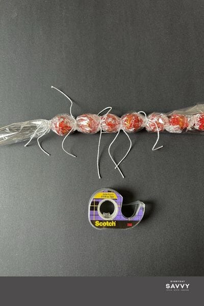 Choose out 6 or 7 of your choice of large, round chocolate candies. I like to do all one color, but you can vary the colors too. Cut a long piece of cellophane (the length of the roll), and tall enough to wrap around the row of candies, 1.5 times around the row. Lay out the row of candies with a small space in between each candy, roll them like a tube and secure the seam with 1-2 pieces of clear scotch tape.