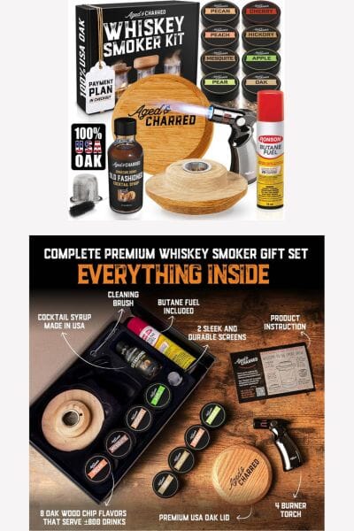Combining quality, performance, and presentation, this Aged and Charred Cocktail Smoker Kit is the ultimate gift for men and dad. With it's Innovative Patent-Pending Design - Experience superior craftsmanship with this whisky and cocktail smoker kit, designed to infuse rich, smoky flavor into your whiskey or bourbon in seconds. Made from 100% oak, the Smoke Lid features a tapered base that fits rocks, Glencairn, coupe, and pint glasses. Includes a premium Old Fashioned syrup for crafting the perfect smoked cocktail at home. This Complete Old Fashioned Smoker Kit – Everything You Need for Smoked Cocktails - Our old fashioned smoker kit includes an oak smoker lid, refillable 4-burner torch, 8 flavors of premium wood chips, 2 stainless steel screens, 75ml of butane, and Old Fashioned cocktail syrup. This all-in-one drink smoker kit ensures convenience, consistency, and rich flavor in every pour.