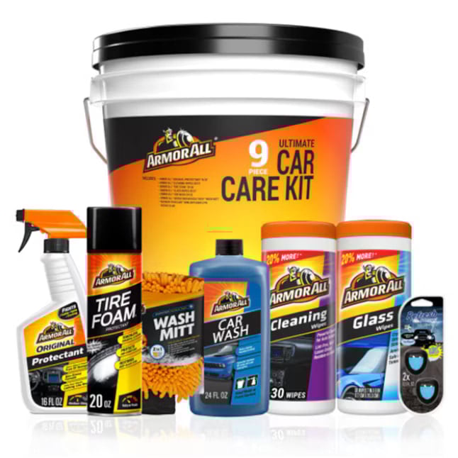 Your guy can clean and protect his car inside and out with the affordable Armor All 9-Piece Car Cleaning Kit. The Armor All Car Care Kit includes a bucket with a lid and 7 different car care products: Armor All Car Wash (24 oz), Armor All Microfiber Noodle Tech Wash Mitt, Armor All Tire Foam Protectant (20 oz), Armor All Glass Wipes (30 ct), Armor All Cleaning Wipes (30 ct), Armor All Original Protectant Spray (16 oz) and Refresh Your Car! Mini Diffusers Air Fresheners (2 pack). This car cleaning kit makes a great gift for anyone who loves their car, from auto enthusiasts to dedicated owners. It’s also a great addition to your own car washing supplies. Armor All Car Wash and the Armor All Microfiber Noodle Tech Wash Mitt work together to gently lift away dirt and road grime. Armor All Tire Foam Protectant protects tires from harmful elements that can cause cracking and fading. Armor All Glass Cleaner Wipes leave interior and exterior glass spotless with a streak-free finish. Armor All Cleaning Wipes reveal the rich, natural beauty of your vehicle’s interior, while Armor All Original Protectant Spray protects it from harmful elements like UV rays. Help keep your vehicle looking and feeling new with Armor All.