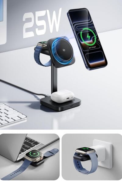 There are a lot of magsafe chargers out there, but this ESR 3-in-1 Magsafe Charging Station has some unique and cool features. He can harge his iPhone, AirPods, and Apple Watch simultaneously with a compact MagSafe charger stand; declutter your desk and nightstand, making multi-device charging easier and more convenient at home or in the office. This charging station has a Cryoboost cooling fan that kicks on if your phone starts to get warm from charging (you can also disable this feature). Plus, you can unplug the watch charger to take it on-the-go to plug into any USB port. This iPhone charging station features certified Qi2.2 and CryoBoost phone-cooling technology, providing 25W ultra-fast wireless charging, allowing you to charge your iPhone 17 or 17 Pro to 60% in just 30 minutes; Qi2.2 and MagSafe compatibility lets you enjoy snap-to-charge convenience.