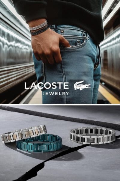 Lacoste jewelry is hot right now for guys and this Lacoste Metropole Bracelet is a popular item. Plus it comes in a few different metal colorways. This cool bracelet is stainless steel with a fold over clasp. See the black-plated, mixed metal bracelet and more colorways. You can also find the Lacoste Metropole Bracelet on Amazon.