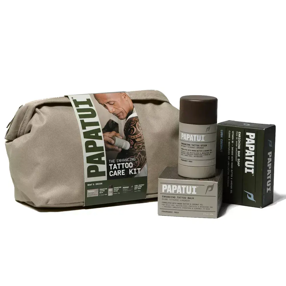 Papatui is a highly-reviewed, newer body and skincare created by the Rock, Dwayne Johnson. This Papatui Men's Tattoo Care Kit is the perfect set for any guy that needs tattoo care. Gift the ultimate tattoo care experience with the Papatui Men's Tattoo Care Kit. Created by founder, Dwayne "The Rock" Johnson, this limited-edition kit consists of: Enhancing Tattoo Balm, Enhancing Tattoo Stick, and best-selling Lush Coconut Enriching Bar Soap, all in an exclusive Papatui re-usable dopp kit. This kit comes with all the essentials to revitalize and protect your ink, while keeping skin hydrated.