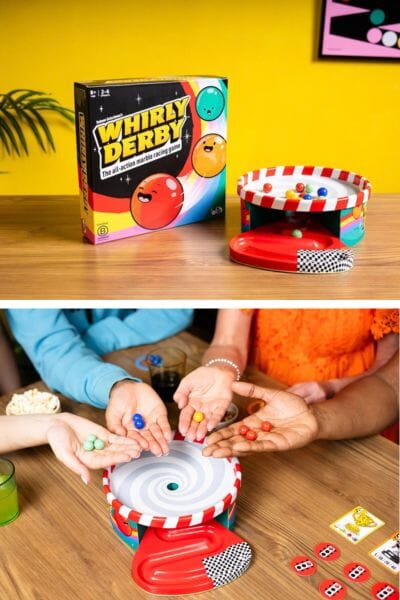 Your boys will love this cool and retro-looking Whirly Derby Marble Racing Game! It is a simple game play with a whole lot of energy! Helplessly watch your marble as it races around the speedway. Lost the round? No worries, the Slowness Bonus means you’ll have the chance to catch up in the next one! This game has a fun the balance between luck and skill just right, so it’s super-easy to learn but rewarding to play.