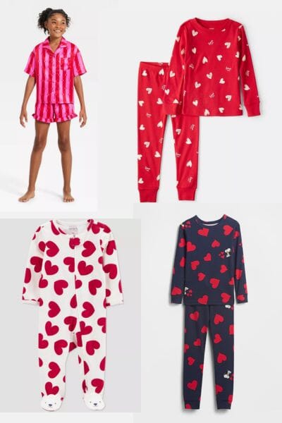 Your kids will love getting new PJs for Valentine's Day and you can find them in all sorts of fun styles. These adorable satin Art Class pink and red pajamas are super cute for kids. If you are looking for both festive and affordable pajamas for toddlers, these red pajamas with hearts are perfect. These classic Heart pajamas for babies are just so cute and affordable. These organic Peanuts Valentine's Pajamas are fun for kids and you can also find Peanuts pajama pants for older kids.