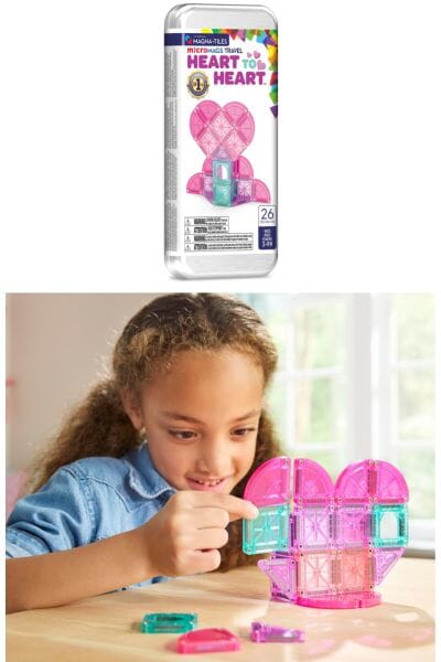 My kids loved Magna-Tiles when they were little and this travel set is perfect for Valentine's Day! The Magna-Tiles MicroMags 26-Piece Heart to Heart Travel Set is a fun and unique magnetic tile set that includes glittering tiles, decorative arch windows, and vibrant quarter circles, this set brings a bold pop of personality and heart to any build. These building tiles encourage creative storytelling while building fine motor skills, hand-eye coordination, and early STEM concepts.