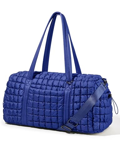 This beautiful and affordable Quilted Duffle Weekender Bag is perfect for sleepovers or quick weekend trips! It comes in lots of pretty colorways. It's sized at 21'' L x 9.5'' W x 10'' H with a 31L capacity with interior slip pockets, an interior zippered pocket, an outer water bottle pocket, side pocket and more. This bag provides plenty of room for 2-3 days worth of essentials. Perfect for packing clothes, toiletries, a laptop, etc. It also meets most international carry-on requirements. Plus, this bag includes a detachable, adjustable strap (34" to 53") for hand, shoulder, or crossbody wear. The back sleeve easily slides over luggage handles for hands-free travel and features a hidden zipper pocket for added security.