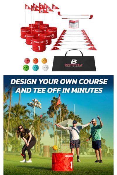 BucketGolf is the ultimate backyard golf game that combines the excitement of golf with the ease of backyard games. It's highly portable with an easy set up and great for all levels. This set is great for the backyard, camping or the beach too! Adults, teens and kids of all ages will love this game and it's a great family game. Includes: 6 pop up buckets(holes), 6 flagsticks, 6 balls, 6 tee boxes, carry bag, 3 scorecards, and 2-4 clubs. Choose the correct bundle, whether he's right handed, left handed or you can choose one of each!