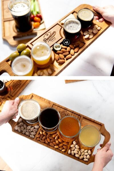 I love these beautifully engraved Beer Flight Trays with optional glasses. They are perfect for beer and some snacks and come in both a small and a large size and beautiful engraving options. Serve your guests with style and panache with a personalized Beer Flight Serving Trays. These cleverly designed Beer Flight Trays hold the wider flared part of the glass for stable carrying and serving. They are designed to hold most any size or shape of beer glass. The smaller Taster Flight Tray holds smaller taster glasses, most any style or shape fits perfectly. You can also find a coordinating Charcuterie Tray!