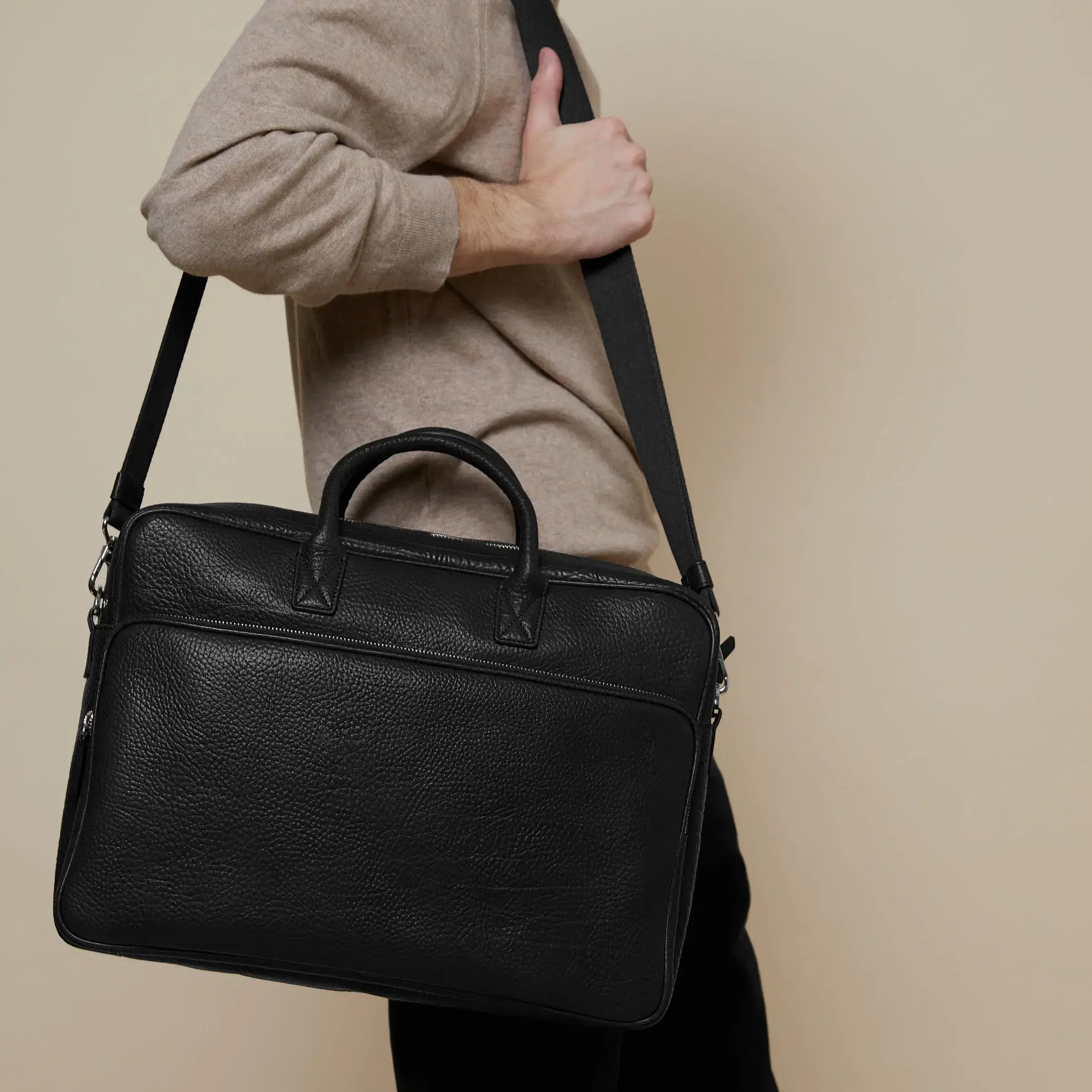Upgrade his workday with the Henderson Laptop Brief Bag. Polished and versatile, it’s perfect for business essentials. Monogram-ready and ships quickly! It is made of Italian full grain leather and fits a laptop up to 15 inches. This laptop briefcase has an understated front compartment with two layers of pockets for smaller everyday items like pens, memos, or a phone charger. The main compartment has a neoprene sleeve and attached leather and Velcro flap to keep your laptop in place. A large zipped pocket is your spot for a phone or wallet, and two open pockets can store power cords or an external hard drive. Handy as a travel bag, the Henderson has a convertible back pocket that unzips at the base for secure storage on top of your luggage. Choose from smooth or premium textured leather in a few great colorways.