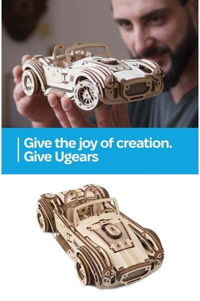 If your guy loves to tinker, meet the Ugears Drift Racing Car wooden 3D puzzle, an original reproduction of a legendary muscle car from the past century. We know you love car modelling and you love the Ugears Dream Cabriolet, Roadster, and U-9 Grand Prix. Well, make room on the shelf, because a powerful new mechanical model just muscled its way into the Ugears Automotive collection. Introducing the Drift Cobra Racing Car, a beautifully-styled, two-seat convertible Ugears Drift Cobra Racing Car Puzzle. This puzzle assembles easily without glue or special tools, providing a seamless and enjoyable model kit building experience.