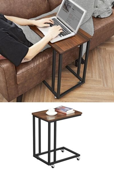 It's the modern TV tray! My husband has a similar table to this Rolling Wood Table Tray and he loves it. You can use it near the couch, near his recliner or by the bed to hold the essentials. This table is made of engineered wood and steel and includes wheels to make it mobile!