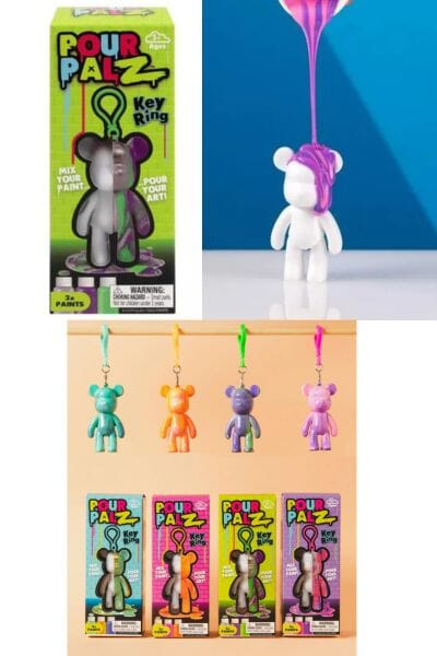 Your tweens will love making this cool Pour Palz DIY Paint Bear Mini Keychain for their backpack. These paintable bears start life as blank canvases, but once you let your creativity run wild pouring, swirling, and mixing paints into eye-catching marbled designs, they transform into works of art. If you’re looking for your next craft project, a unique gift or a way to spark your tween's imagination—this is it! Every kit includes one blank canvas bear, three non-toxic acrylic paints, a mixing cup and spoon, one surface cover sheet and gloves. Go on, pour your art out. Colors may vary.
