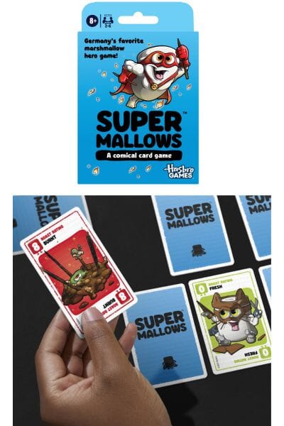 Hasbro brought Germany's favorite card game to the U.S., Super Mallows and your tweens and besides being fun, your tweens will love the artwork! Find out why the Supermallows game is Germany’s favorite marshmallow superhero game! In this light strategy card game, the lower the points, the sweeter the score! Collect the cards with the lowest values. Each player starts with 6 facedown cards. They can peek at 2, but the rest are a mystery. Throughout the round, players try to find out what point value is hidden among their cards, as they strategize to get cards with the lowest points. Use Action cards to sabotage friends or gain extra turns. The player with the lowest total value wins the round. And the player with the lowest value at the end of 6 rounds wins the game!